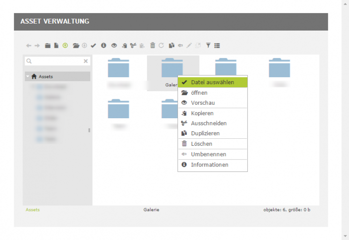 Durch einen Mausklick auf den Button "Server durchsuchen", wird die Verbindung zur Asset-Verwaltung hergestellt. In der Asset-Verwaltung wird der gewünschte Ordner per Rechtsklick ausgewählt. Das Galerie-Widget zeigt alle Bilder im gewählten Ordner an.
